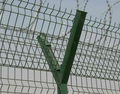 機(jī)場護(hù)欄網(wǎng)又稱作“Y型安全防御護(hù)網(wǎng)”,是由V型支架立柱,加強(qiáng)型焊接片網(wǎng),安全防盜連接件和熱鍍鋅刀片刺籠組成強(qiáng)度和安全防御性級別很高。近年來,被廣泛應(yīng)用在機(jī)場,軍事基地等高安全場所。注:如果在機(jī)場護(hù)欄網(wǎng)頂部加裝刀片刺絲、刀片刺繩后又很好的增強(qiáng)了安全防護(hù)性能。